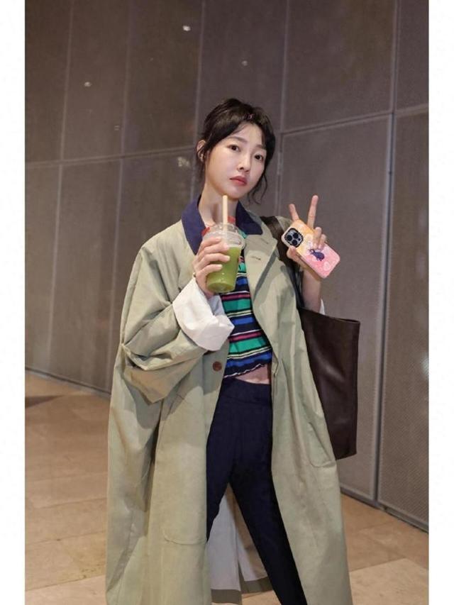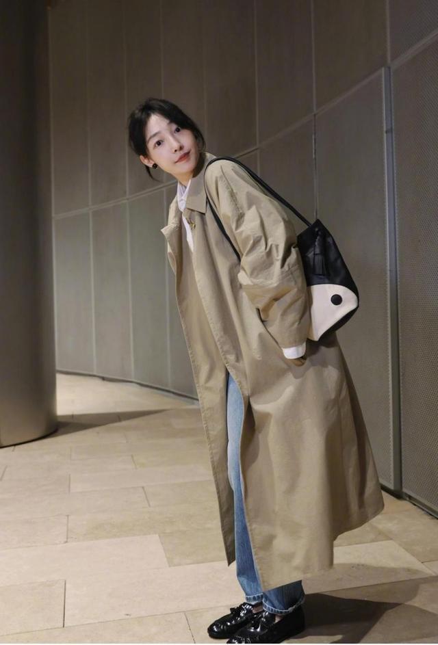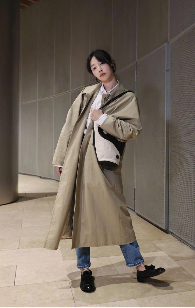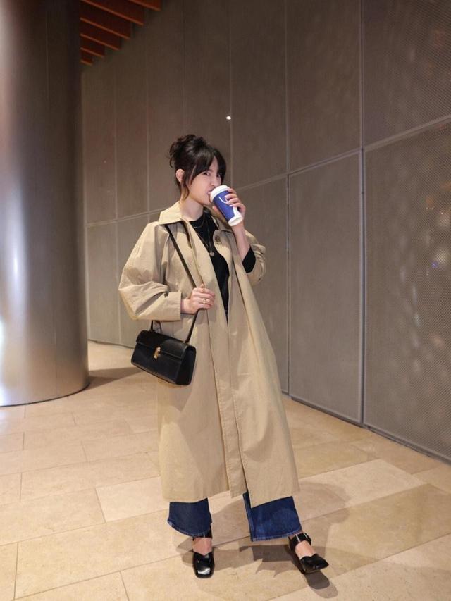 这款卡其色风衣里边配的是黑色打底衫,面料看起来是贴身的针织材质,刚好贴合身形,不会显得穿着者有臃肿感。腿上是深蓝色牛仔裤,为阔腿版型,裤长盖住了脚踝,距离脚面还有一点点距离,因此很适合小个子女生。
