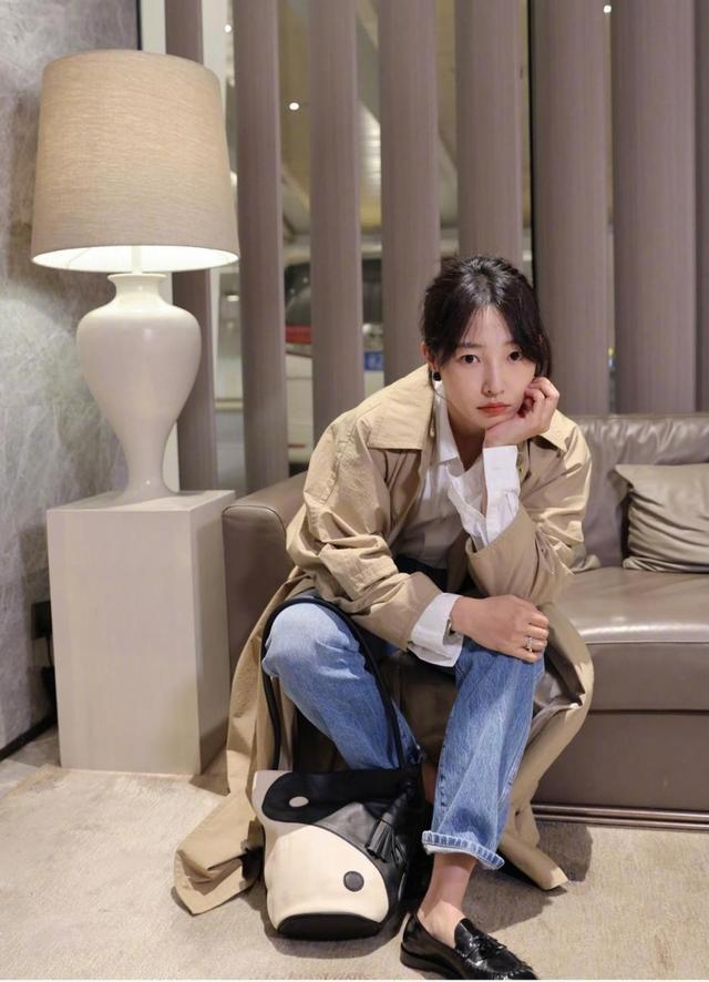 白色衬衣春天穿的女生倒不少,除了搭配正装,单穿也极具减龄效果。浅蓝色牛仔裤和白衬衫一样,都拥有百搭性。这条裤子微微宽松,不是特显腿型的紧身款。裤脚只挽起来了一丢丢,这可以理解,毕竟裤子本身就不是很长,就算不挽裤腿都行。如果你直接选择九分、八分裤,可试试裤脚融入毛边设计的裤子,时尚感只增不少。