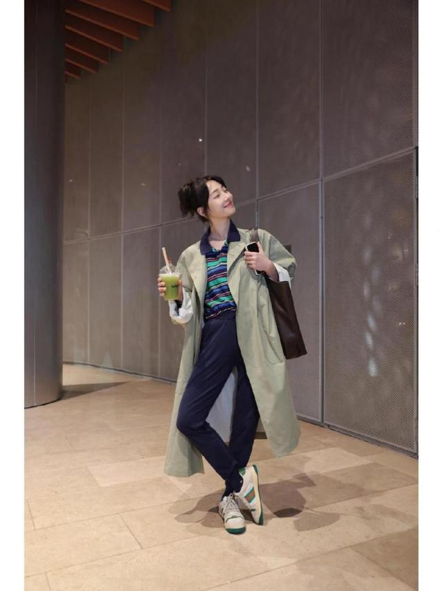 这款风衣版型挺宽松,衣长延伸到了小腿肚那里,不管门襟是否敞开,想要给人留下走路带风的印象不是难事。面料虽然带有挺阔感,但摸上去丝毫不会硬邦邦。袖口面料翻折,将里面米白色的内衬露了出来,超级有细节感。里面穿了一件POLO衫,融入了彩色条纹设计,有蓝、绿、红、黑多个颜色,混在一起超具时尚感。横条看着比较随性,下摆有点短,好处是露出小蛮腰,身材比例也更贴近三七分。