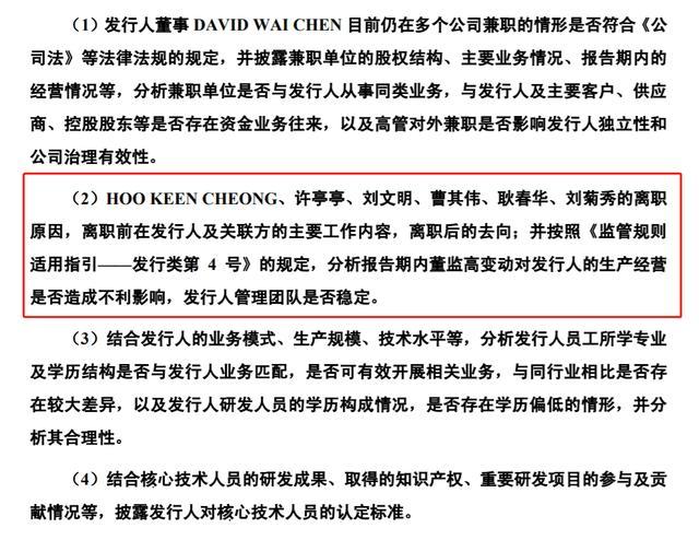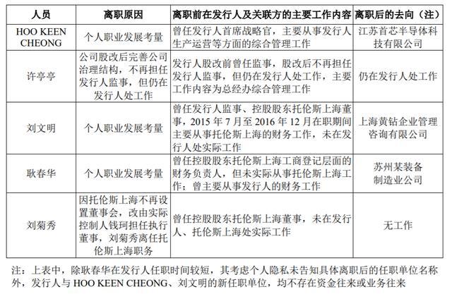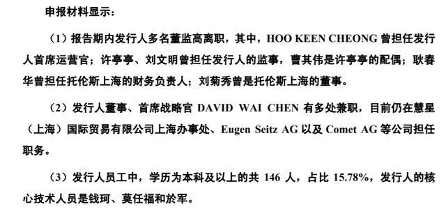 申报材料显示,报告期内托伦斯多名董监高离职,其中,HOO KEEN CHEONG曾担任托伦斯首席运营官(COO);许亭亭、刘文明曾担任托伦斯的监事,曹其伟是许亭亭的配偶;耿春华曾担任托伦斯上海的财务负责人;刘菊秀曾是托伦斯上海的董事。