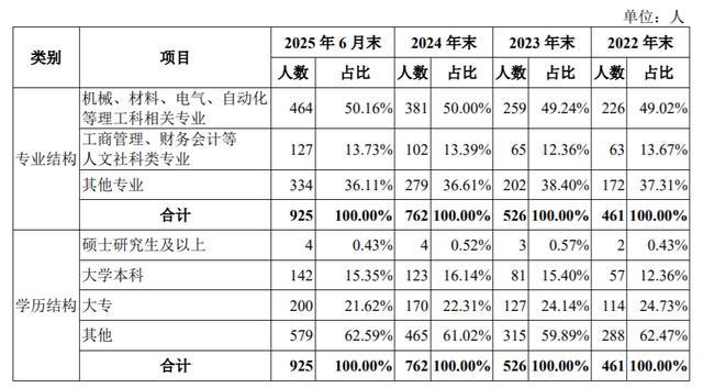 截至2025年6月30日,公司硕士研究生及以上学历人员占比0.43%证劵配资网,大学本科学历人员占比15.35%,大专学历人员占比21.62%,其他学历人员占比62.59%。
