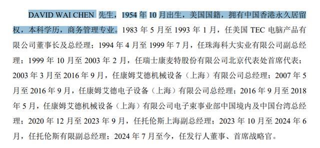 据子公司,DAVID WAI CHEN,1954年10月出生,美国国籍,拥有中国香港永久居留权,本科学历,商务管理专业。