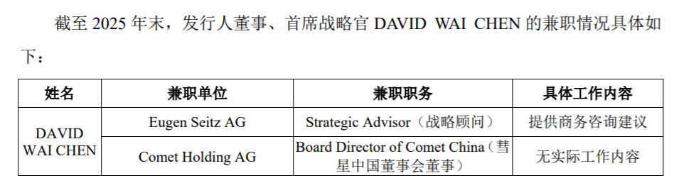 截至本回复出具之日,DAVID WAI CHEN曾经的兼职单位慧星(上海)国际贸易有限公司上海办事处已办理完毕注销登记手续,并于2025年12月25日取得中国(上海)自由贸易试验区市场监督管理局核发的予以注销登记的《登记通知书》。
